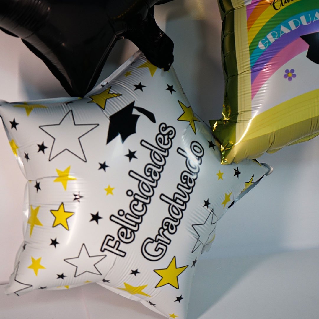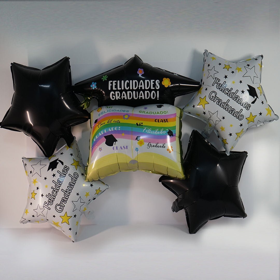 عبارة “Felicidades Graduado!” (تهانينا أيها الخريج!)، بالإضافة إلى بالون مستطيل الشكل يشبه الكتاب وعليه رسومات ملونة وكلمات مثل “GRADUADO” و “CLASE”.