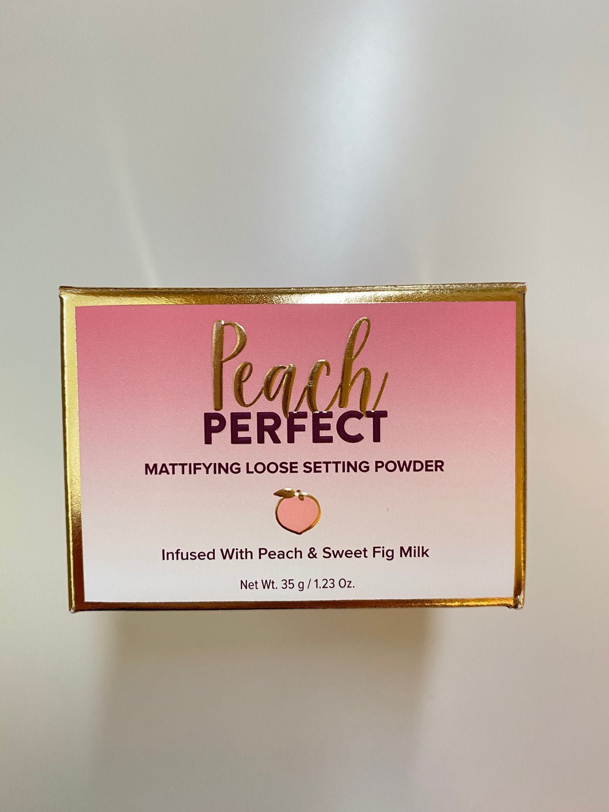 Peach Perfect Mattifying Setting Powder “Too Faced”.