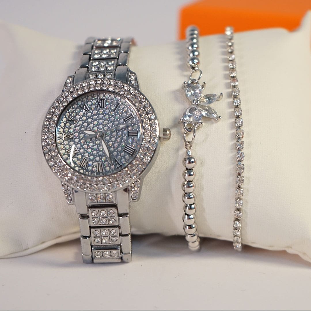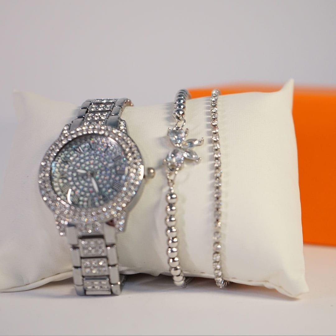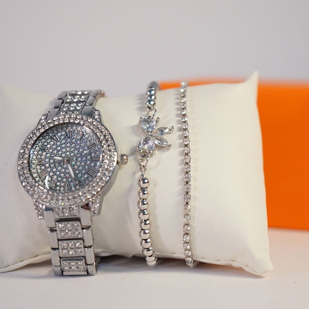 ساعة نسائيه مطرزة بالماس – فضي